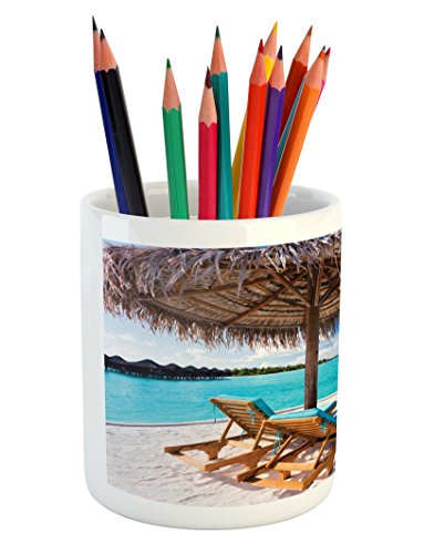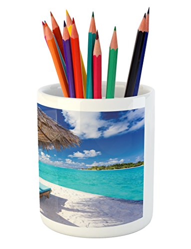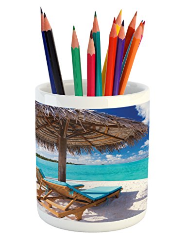 -. Binding : Kitchen -. Brand : Ambesonne -. Color : Multi 1 -. Feature : MATERIAL and SIZE - %100 White Glossy Ceramic. Size: 3.6" height & 3.2" width / FEATURES - Wrap-around printed art on premium quality ceramic. Highly unique. Versatile. FUN. / DESIGNER ARTWORK - Inspirational designs will help organize your pens, pencils brushes & stationary. / DURABLE - Great decorative object with bold vivid colors & clear image. Long lasting. NO FADING. / PRINTED - with state of the art digital printing technology. Proudly designed & printed in the USA. -. Label : Ambesonne -. Manufacturer : Ambesonne -. Model : pen_8932 -. MPN : pen_8932 -. PackageQuantity : 1 -. PartNumber : pen_8932 -. ProductGroup : Home -. ProductTypeName : HOME -. Publisher : Ambesonne -. Size : 3.6" H By 3.2" W -. Studio : Ambesonne -. Title : Beach Pencil Pen Holder by Ambesonne, Maldives Scenic Seaside View Sunbeds Under Umbrella Romantic Honeymoon Theme, Printed Ceramic Pencil Pen Holder for Desk Office Accessory, Brown Aqua White