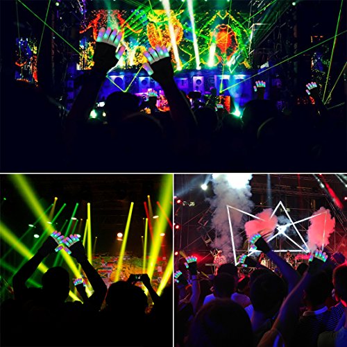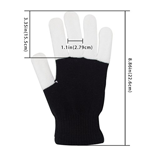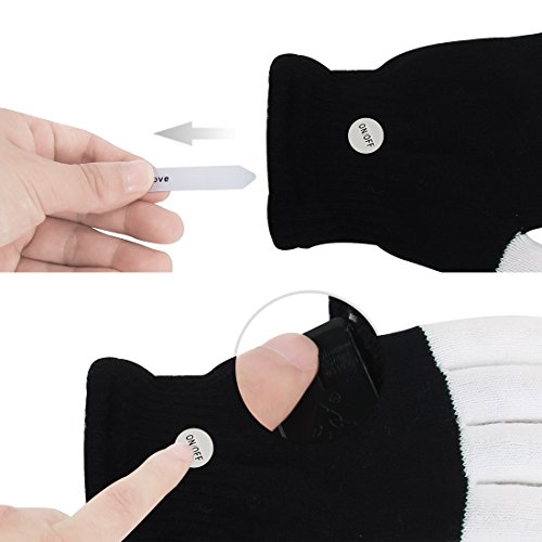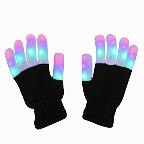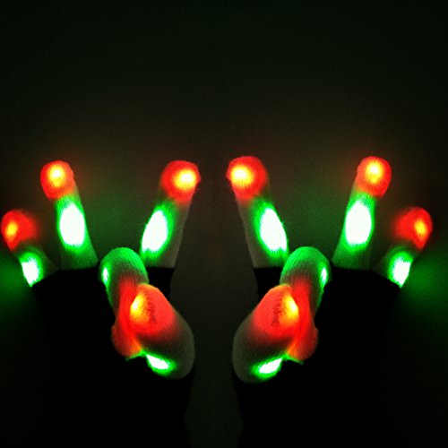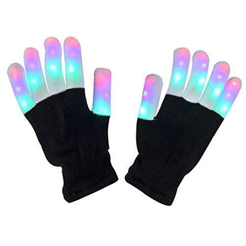 Features: Light up Your Fingers! Try to imagine, when your hands glow in the dark, what a funny thing! Amazing Lights Effect! The Led light has 3 colors: red, green and blue. Each glove has 6 flashing modes. One Size Fits Most! Gloves Size: 8.7 x 0.4 x 3.9 inches. Item Weight: 3.6 ounces. Suitable for adults and kids. Batteries Included! Using non-rechargeable button battery-powered, often flash can be used for more than 12 hours. Comfortable To Wear! Cotton and acrylic materials, easy to wear, keep you warm in this autumn and winter.