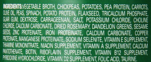 -. Feature : New packaging, same great vegan recipe, formerly called Vegan Garden Medley / No rice; completely plant-based protein from lower glycemic peas and chickpeas / Vegan dog food with chickpeas, non-GMO vegetables and fruits, and nourishing oils / An alternative to a meat based diet that delivers the same essential nutrients and is complete and balanced for dogs / Non-GMO vegetables and fruits, no artificial colors or flavors, no preservatives of any kind, BPA free cans