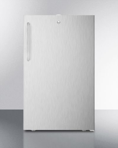 Sized at just under 20" wide, the ETL-S listed CM421BL7CSS can be used built-in or freestanding. It has a fully wrapped 304 grade stainless steel cabinet complete with a pro towel bar handle. The top-mounted keyed lock offers convenient security for the manual defrost interior. Additional features include adjustable glass shelves, a clear crisper drawer, a an ice cube compartment, interior light, and hospital grade cord for added safety in busy areas.Feature