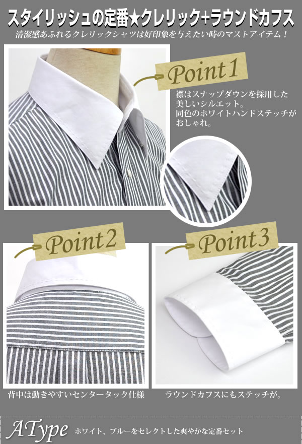清潔感あふれるクレリックシャツは好印象を与えたい時のマストアイテム!襟はスナップダウンを採用した美しいシルエット。襟とカフスにはホワイトのハンドステッチ入り。細身のラインもオシャレ!
