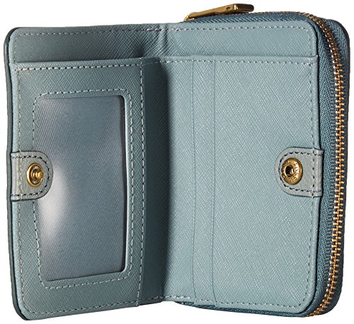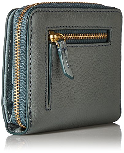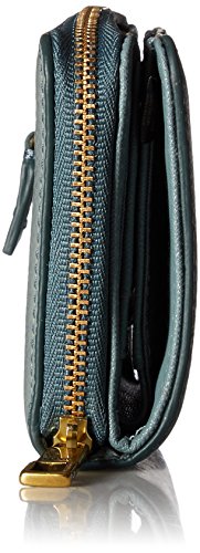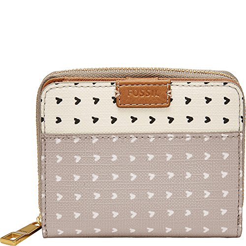 Measurements: 4.38"l x 1"w x 4"h; interior features: 1 bill compartment, 5 credit card slots, 1 id window and 1 zipper pocket; exterior features: 1 back zipper pocket