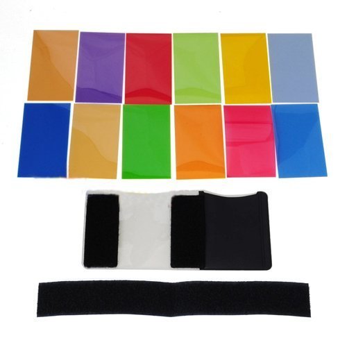 12 pieces Color Gel Filters for lighting effects and color correction. Cut to fit most Flash model. Includes the largest selection of popular colors for controlling light from your strobes