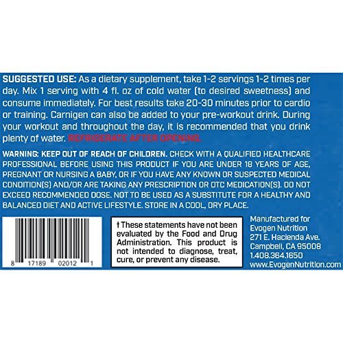 -. Binding : Health and Beauty -. Brand : Evogen Nutrition -. EAN : 0817189020121 -. Feature : Stim Free Caffeine Free High Quality Blend: Four types of carnitine while others only have one / Convert Fat To Energy: the perfect stomach fat burner for men and women before cardio or training / L-CARNITINE L-TARTRATE - this form of carnitine is known for having excellent bioavailability. It has a wealth of research to support its role in providing cellular energy and recovery from exercise / L-CARNITINE L-FUMARATE - known as a highly stable form of carnitine, it donates l-carnitine to shuttle fatty acid and assist in transporting it across mitochondrial membranes into the mitochondria for energy production -. IsAdultProduct : 0 -. Label : Evogen -. LegalDisclaimer : Other Ingredients: -. Manufacturer : Evogen -. MPN : EVG00198 -. PackageQuantity : 1 -. PartNumber : EVG00198 -. ProductGroup : Health and Beauty -. ProductTypeName : HEALTH_PERSONAL_CARE -. Publisher : Evogen -. Size : 90 Servings -. Studio : Evogen -. Title : Evogen Carnigen | Fat Burning Carnitine Powder | Grape | 90 Servings … -. UPC : 817189020121