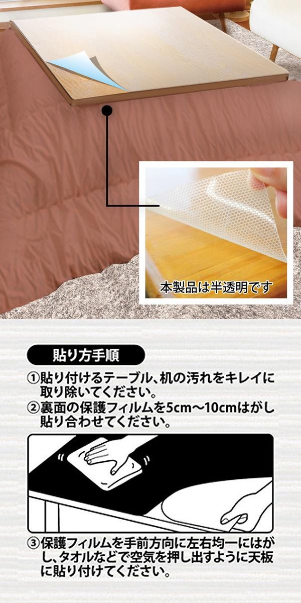 | こたつの天板をキズや汚れから守ります。カッターやはさみで簡単にカットできますので、天板のサイズや形に合わせて貼ることができます。汚れも、サッとひと拭きするだけでキレイになります。 |