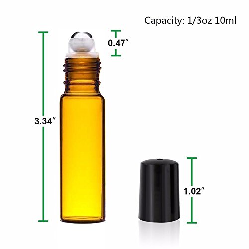 Amber Roller Bottles Roll On Bottles with Steel Roller Balls for Essential Oils, Perfume, Wax, Lip Balm, Deodorant, set of 12, 10ml & 3ml, WITH FREE OPENER & DROPPER