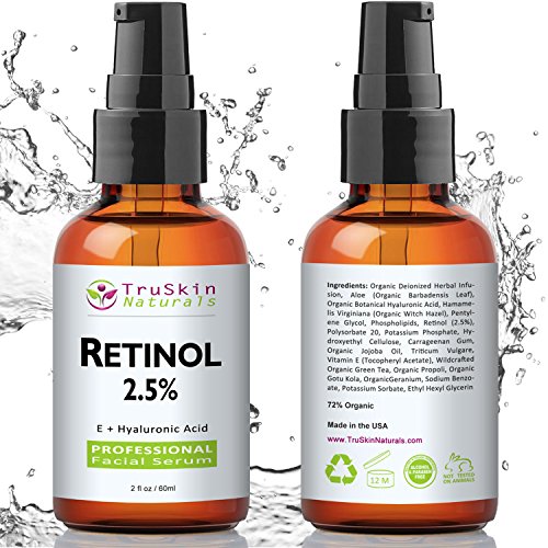 -. Binding : Misc. -. Brand : TruSkin Naturals -. Feature : RETINOL WORKS! Vitamin A (Retinol) has been proven to be one of the most effective ingredients to improve fine lines, wrinkles, skin tone, skin texture, color, pigmentation, as well as your skin's hydration levels. / UNLIKE HEAVY RETINOL CREAMS, this unique and light-weight anti-aging serum has been specially developed to layer well under other skin care products. / HIGHEST QUALITY ORGANIC & NATURAL INGREDIENTS - Formulated with 97% natural & 72% organic ingredients, this plant-based anti-aging Serum contains No Parabens, No GMO's, NO Alcohol, No Fillers, and is Fragrance-Free. / MADE IN USA - TruSkin Naturals Serums are proudly formulated and bottled right here in the USA in an FDA-Registered Laboratory and are NEVER TESTED ON ANIMALS - Cruelty Free. / MONEY BACK GUARANTEE - Unlike other brands, TruSkin Naturals prides themselves in providing the absolute best customer service in the industry. If for any reason you decide that this retinol serum is not for you, you have a full 3 months to send 1 simple email and receive a 100% money-back refund, absolutely no questions asked (in fact, you don't even have to return the bottle). -. Label : TruSkin Naturals -. Manufacturer : TruSkin Naturals -. MPN : Best Retinol Serum -. PartNumber : Best Retinol Serum -. ProductGroup : Beauty -. ProductTypeName : BEAUTY -. Publisher : TruSkin Naturals -. Studio : TruSkin Naturals -. Title : BEST Retinol Serum for Wrinkles & Fine Lines | 2.5% Vitamin A + Hyaluronic Acid, Vitamin E, Organic Green Tea, Aloe Vera & Jojoba Oil | Deeply Penetrates Skin to Reduce Wrinkles & Fine Lines and Unclog Pores & Treat Acne | Works Best With TruSkin Naturals Vitamin C Anti Aging Serum