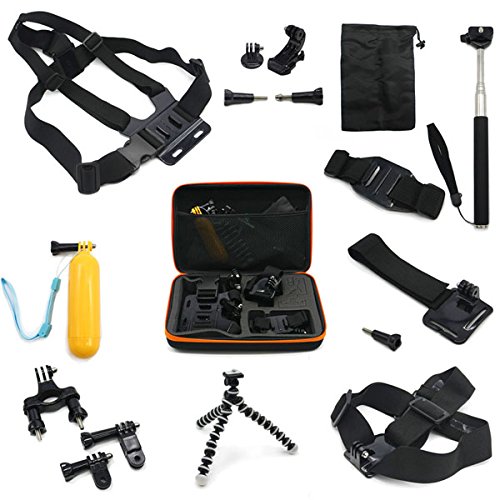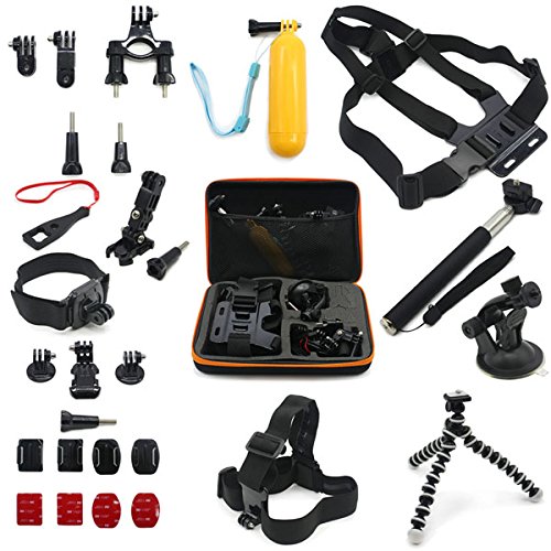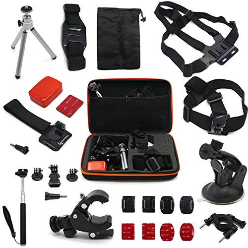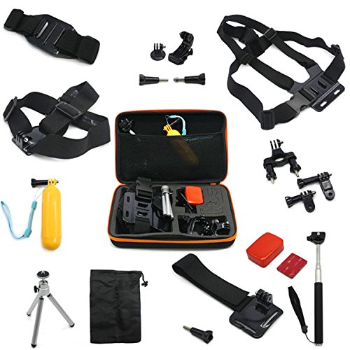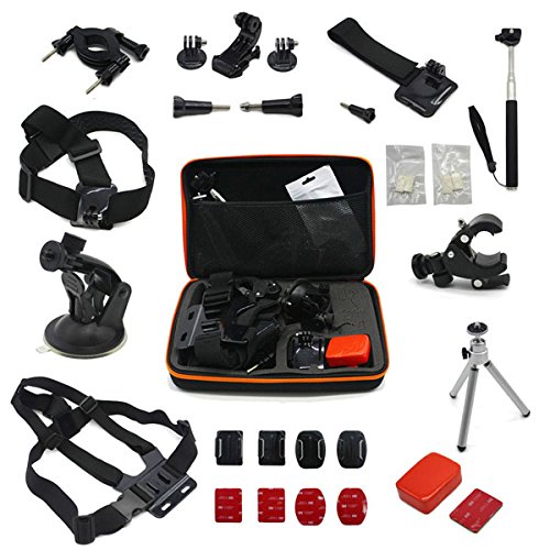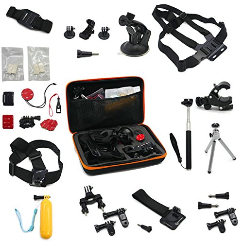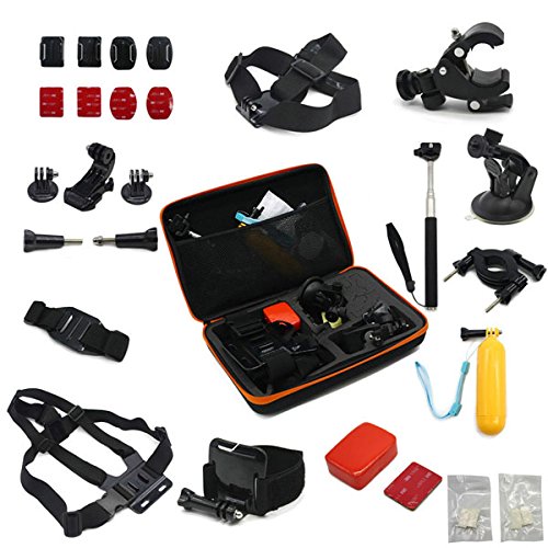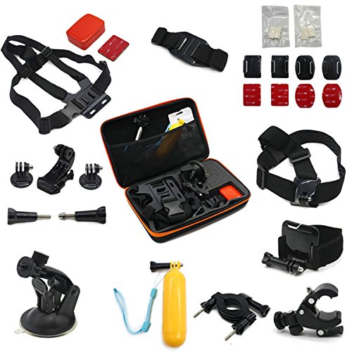 Buy as a kit and save. These are awesome accessories for Gopro HD Hero 4/3+/3/2/1 Camera….Adhesive tether surf mount and flat Adhesive mount: The adhesive tether surf and flat mounts are great accessories to provide extra protection to your Gopro camera from dropping......Anti fog inserts: Compatible Camera Models: Insert at both sides of protective housing, protects camera lens from fog.....J-Hook Mount, Tripod Adapter and Screw: J-Hook design makes your camera outstanding and convenient. Tripod mount for attaching your quick-release GoPro camera to a standard 1/4-20 tripod stud....Handlebar Seatpost Bike Mount: Attach your GoPro camera to handlebars, seatposts, ski poles.....Screw Spanner: Secure your camera tighter than tighten it by hand.....Mini silver tripod-2 section: Multi-angle adjustment, can be adjusted to any comprehensive angle you need. Can rotate 360 degrees......Floating Grip + Screw: Multifunction Floating Hand Grip Monopod Mount Screw Bobber.....Extendable Handheld Monopod: Extends to 105 cm. Closes to 22 cm. Adapter rotates 180-degrees......Auto Suction Cup + Tripod Mount: Dash/Windshield Suction mount for GoPro Camera.....Wrist Strap Mount: This Wrist Strap Mount could attach Gopro camera to your wrist, ankle or something with the same size to capture previous moments when you are riding, skiing, surfing, etc.....Roll Cage Mount: Fits bar with diameters of between 1.7cm and 3.5cm....Vented helmet strap mount: This vented helmet strap mount could attach your Gopro camera to vented bike, kayak, ski or other similar sports helmet...... Head Strap Mount: Adjustable strap easily fits all sizes.....Universal bike handlebar active connection Mount: Universal bike handlebar active connection Mount.....Large Hard Gopro Carry Case: Hard EVA outer shell, internal shock-resistant foam internal cut-outs, specifically designed to protect your GoPro camera and Accessories Perfect for GoPro storage when not in use. Size: 32x7x22cm.Feature