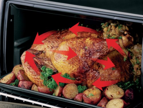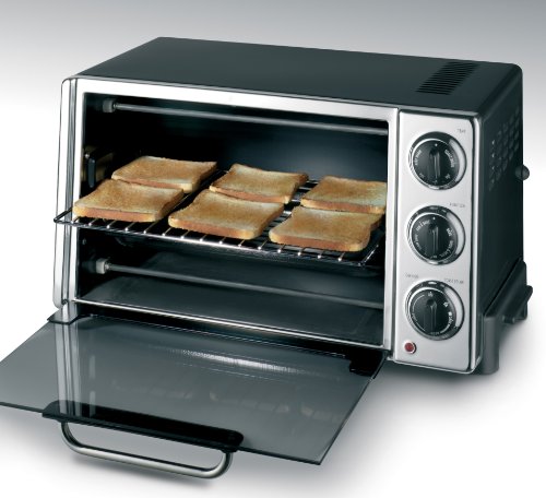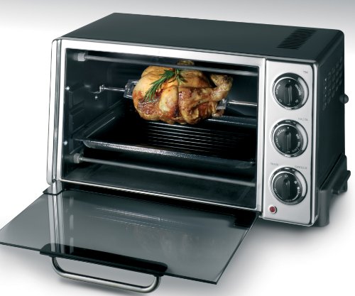 Multi-function 6-slice toaster oven with rotisserie spit;Choose from bake, bake with convection, broil, toast, slow bake, and keep warm;20-liter cavity fits a 12-inch pizza; removable crumb tray; nonstick interior;Nonstick bake pan, nonstick broil tray, and flat rack included;Measures 19-3/8 by 14 by 10-3/7 inches