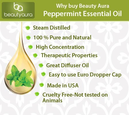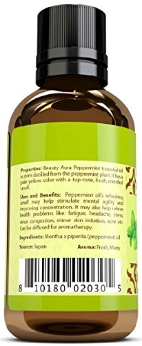 -. Feature : BEST ALTERNATIVE TO TOXIC PEST CONTROL PRODUCTS While humans love the menthol smell of peppermint oil, mice and other pests don't! The potent fragrance of Beauty Aura peppermint oil makes our product the perfect choice of peppermint oil for spiders or peppermint oil for mice. It's the nontoxic solution for your pest control needs / VERSATILE SOLUTION Whether you're looking for extracts for natural hair and skin care or aromatherapy essential oils, peppermint oil from Beauty Aura is the one to choose. You can easily use it as a peppermint oil hair treatment, a skin care treatment or in an aromatherapy diffuser / MAXIMUM POTENCY Our therapeutic grade formula is steam distilled to preserve the active compounds, making it an excellent peppermint oil for hair and skin or for ideal peppermint oil for natural remedies / 100% UNDILUTED & PURE Our pure peppermint oil lives up to its name with no dilutants, synthetic additives, preservatives or artificial colors or fragrances added; it's the best way to experience essential peppermint oil / QUALITY ASSURED We manufacture our peppermint essential oil in the U.S. using the finest Mentha x piperita that Japan has to offer to ensure quality in every bottle