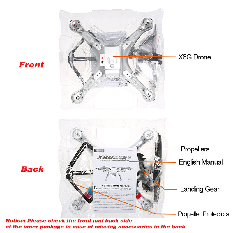 Syma X8G is easy to fly. For standard version, It features a 5.0MP HD camera, 360 degree rotating function and a high precision 6-axis gyro stabilization system providing a wonderful flight performance, which is perfect for both beginners and advanced pilots alike. This version we bring here however, only has aircraft with landing gears and propeller protectors. It's good replacement for owners whose ex-X8G is already broken and hard to fix.