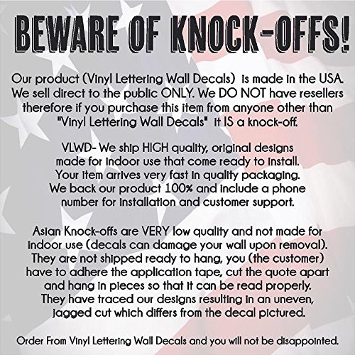 PLEASE READ!!! Before clicking "Add to Cart" be sure that it says "Sold by Wall Sayings Vinyl Lettering". We cannot guarantee the quality of counterfeit decals sold by other sellers. This decal is NOT made in China, and will not ever be shipped by a 3rd party. Counterfeit decals can have jagged edges and either do not stick at all or they take the paint off your wall upon removal. We are the manufacturer and the ONLY seller of our products.