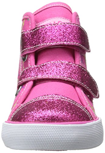 Give her the colorful, sweet style of these Hello Kitty hi-top sneakers! Hello Kitty hi-top sneakers Canvas-look upper with allover print and glitter accents Hook-and-loop straps at vamp Toe cap Grippy sole with cushioned insole Synthetic upper Imported