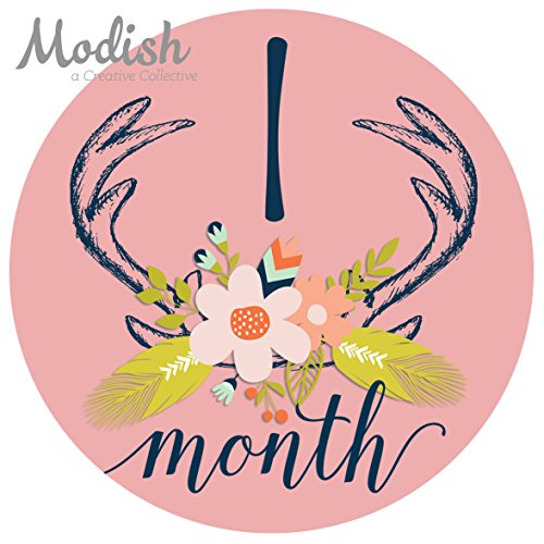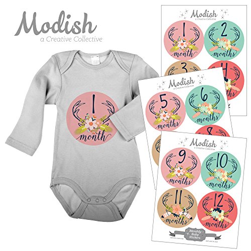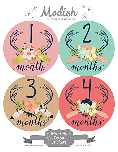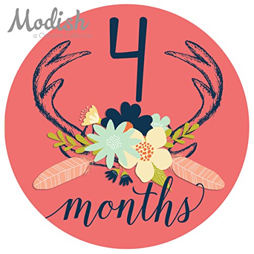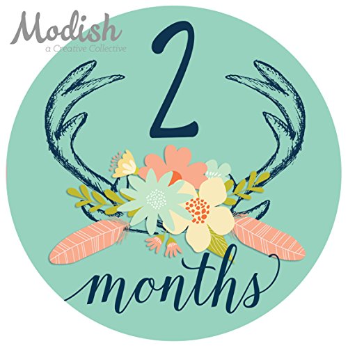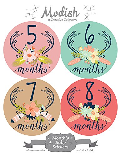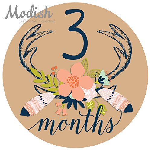 12 Monthly Baby Stickers, Deer Antlers, Girl, Flowers, Feathers, Baby Belly Stickers, Monthly Onesie Stickers, First Year Stickers Months 1-12, Pink,...