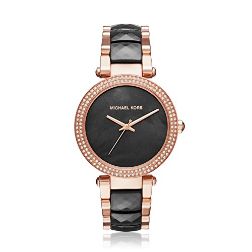 The Michael Kors Parker watch exudes glamour. Polished rose gold-tone stainless steel and faceted black acetate give a warm glow to the three-link bracelet and case, and the black mother-of-pearl dial is accented with a double pave crystal topring.Feature