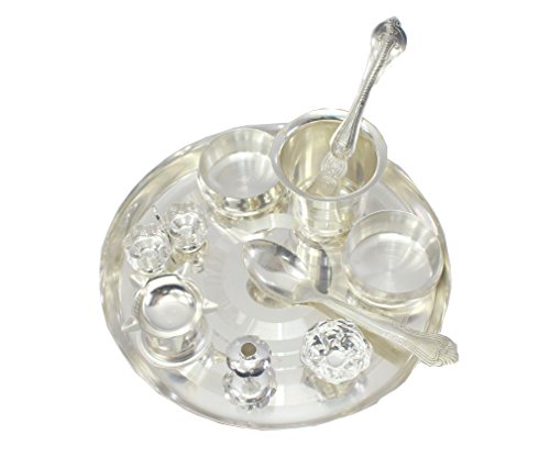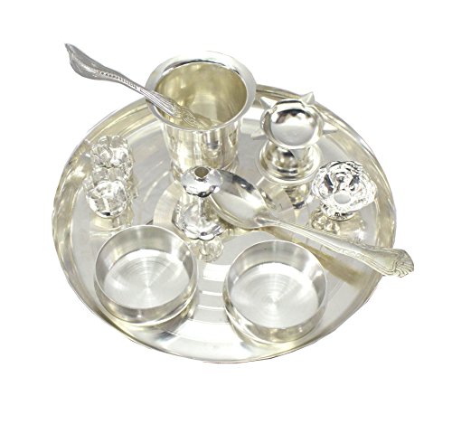 The Pooja Thali Set in German Silver consists of an intricately designed Pooja plate, as well as, an assortment of their items necessary for performing various religious rites during auspicious occasions