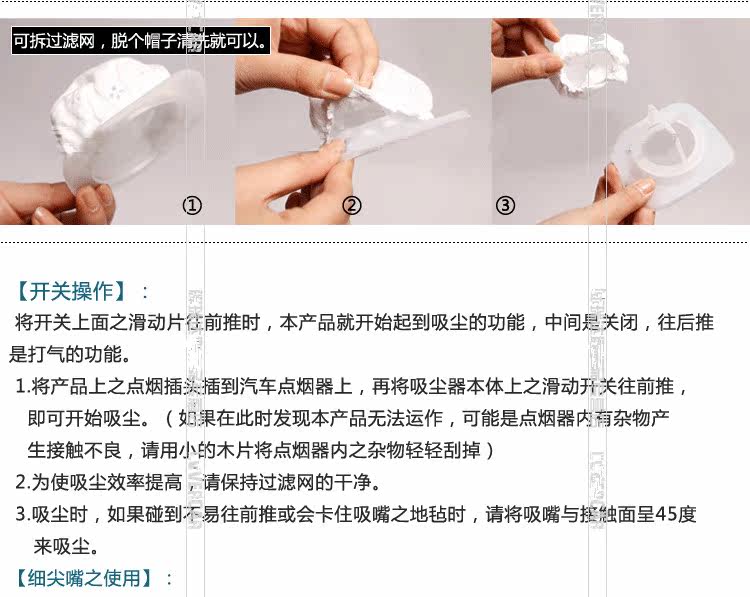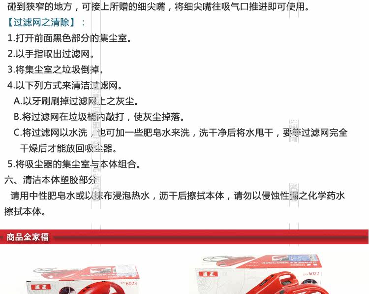 Note: use the filter must be installed no dust absorbing water or aqueous and carpet do not put in direct sunlight high temperature and high pressure place do not use gasoline or detergent volatile strong agent is wiped body motor rotation is not out of the front shell.