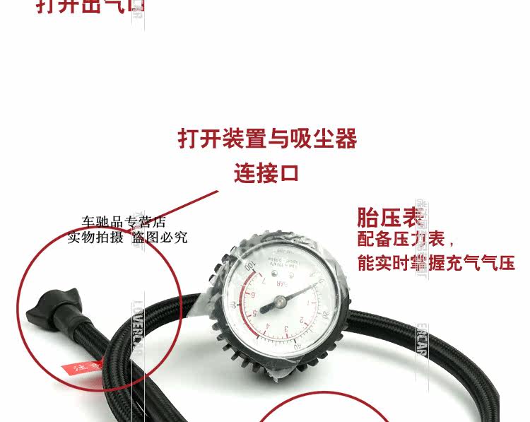 the rubber hose connection lines near the tire pressure table end connecting head is inserted into the connecting hole the pressure valve pressure. The other end of the valveis directly inserted in the tire valve the sound of air leakage said air circulation will soon be valve wrench 90 degrees inwards the air is no longer escape.