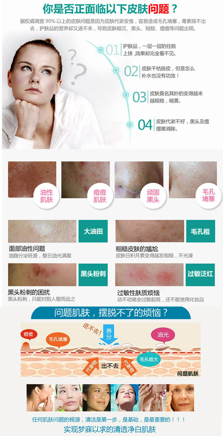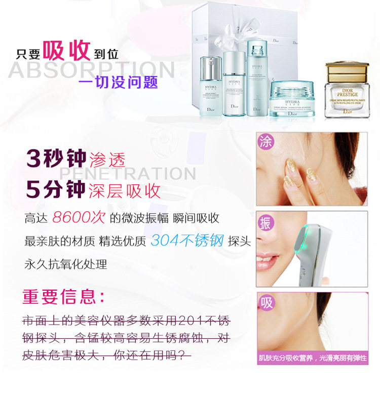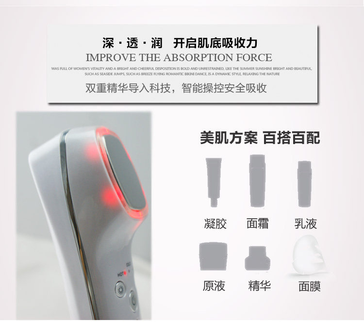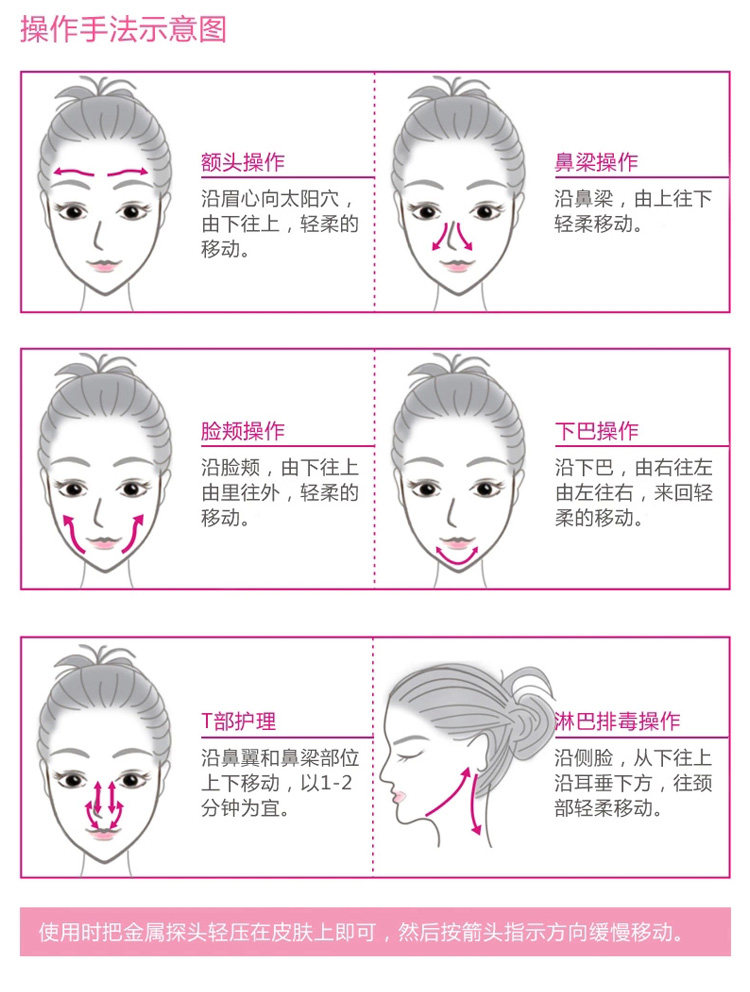 2、刺激血液循环加速,增加血液中含氧量,使毛孔张开,血管扩张,使皮肤上的营养成份迅速吸收是最温和、舒适有效的导入方法。