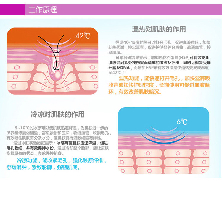 冷热交替使用,对美容有相加、相乘的效果,能自然彻底地活化细胞,改善、净化肤质,是健康、美容最好的养生仪