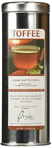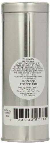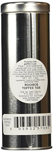 -. Binding : Grocery -. Brand : Hale Tea -. EAN : 0603932570650 -. Feature : 1.5-Ounces of Loose Tea / Toffee bits; Excellent for dessert / Naturally caffeine free; Serve hot. / Interior seal silver tin / Hale Tea Company based in Savannah, Georgia; Traces its roots back to a humble tea shop in London, England in 1872 -. Label : Hale Tea Company -. Manufacturer : Hale Tea Company -. MPN : 13095 -. NumberOfItems : 1 -. PackageQuantity : 1 -. PartNumber : 13095 -. ProductGroup : Grocery -. ProductTypeName : GROCERY -. PublicationDate : 2012-06-11 -. Publisher : Hale Tea Company -. Size : 1.5 Ounces -. Studio : Hale Tea Company -. Title : Hale Tea Rooibos, Toffee, 1.5-Ounce -. UPC : 603932570650
