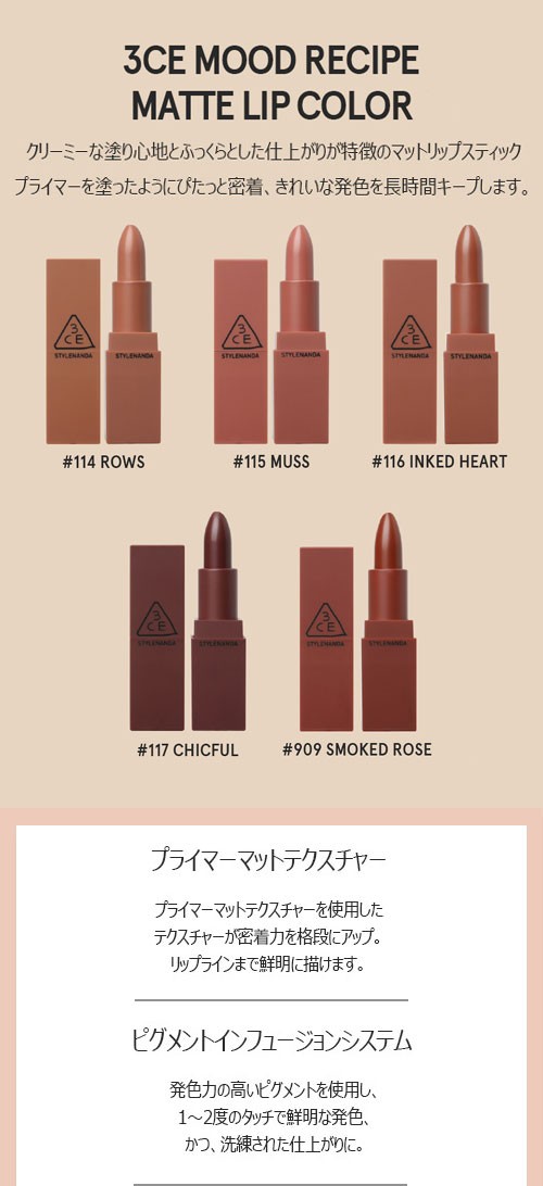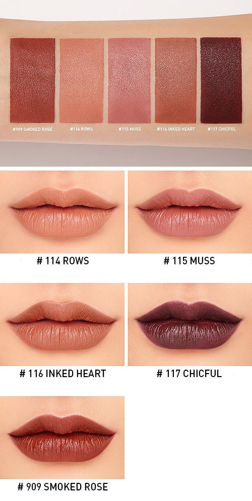 カラー:114 ROWS、115 MUSS、116 INKED HEART、117 CHICFUL、909 SMOKED ROSE