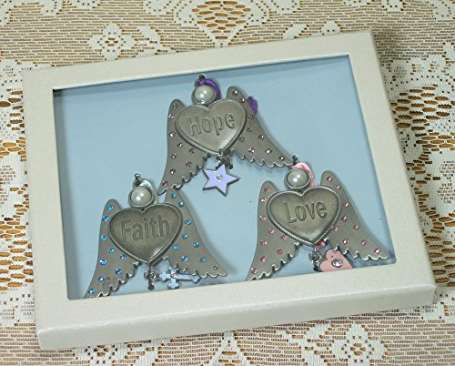 ANGEL CHRISTMAS ORNAMENTS. Set of 3 angel wings with Faith Hope and Love engraved on each heart. The angel wings are embedded with colorful crystals and each one have a hanging charm. Beautifully presented in a silver gift box. Just perfect for that special someone who believes in ANGELS.