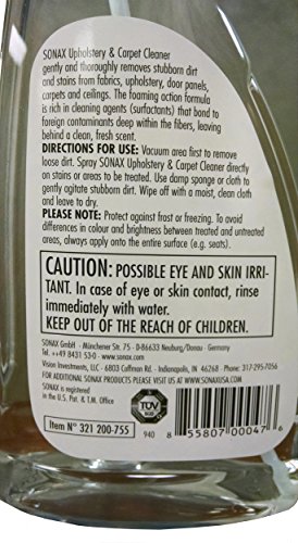 SONAX Upholstery & Carpet Cleaner gently and thoroughly removes stubborn dirt and stains from fabrics, upholstery, door panels, carpets and ceilings. The foaming-action formula is rich in cleaning agents (surfactants) that bond to foreign contaminants deep within the fibers, neutralizing odors and leaving behind a clean, fresh scent.