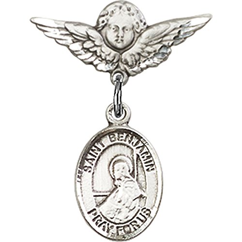 -. Title : Sterling Silver Baby Badge with St. Benjamin Charm and Angel w/Wings Badge Pin 7/8 X 3/4 inches