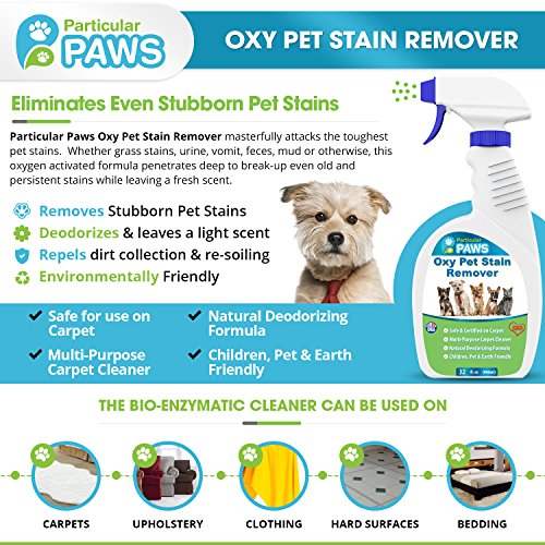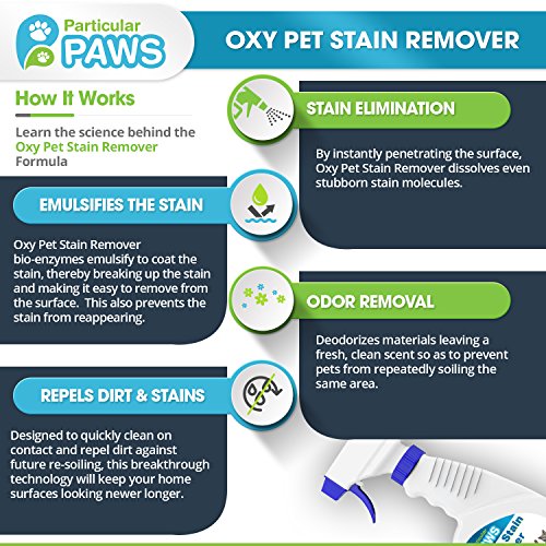 - OXY-POWERED MULTIPURPOSE CLEANER: Pets inevitably have accidents. If you own a dog or cat you need a powerful and safe stain cleaner. Our Oxy Pet Stain Remover will remove the toughest stains from your carpet, upholstery, tile, and other textiles. Our product is effective on the toughest pet messes including; urine, vomit, blood, and feces.