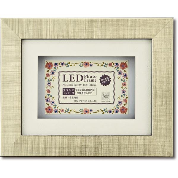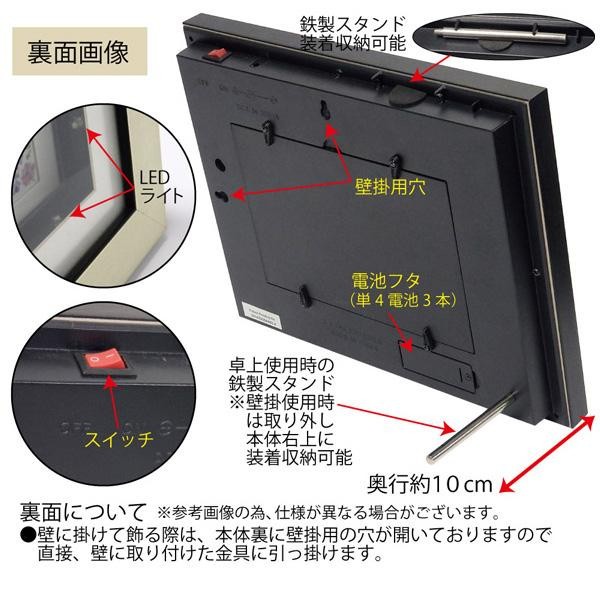 | 仕様 | ●壁掛・卓上両用(縦横両用) ●電源:単4電池×3本 ●1mmマット2枚付 ●音センサー付(音に反応し、自動的に1分間点灯します) ●フォトサイズ:サービスサイズ(89×127mm)~ポストカードサイズ(101×152mm)1枚 |