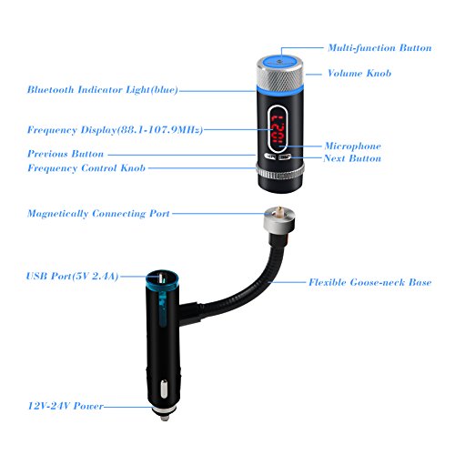 This Woopower Bluetooth FM transmitter is absolutely an ideal accessory for any on-the-go driver in that it integrates a good bunch of amazing functions, such as FM transmitter, hands-free calling, music playing,High-speed charging(5V/2.4A) your device. Besides, the flexible goose pipe further adds ease of use and convenience to this marvelous unit.