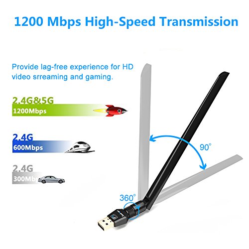 1200Mbps wireless USB wifi adapter. 867Mbps on 5GHz and 300Mbps on 2.4GHz. High transmission speed guarantee seamless and lag-free HD streaming, online gaming and other bandwidth-intensive tasks.
