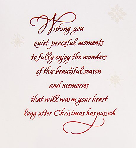 Studio : Hallmark Marketing Company, LLC (Office) Publisher : Hallmark Marketing Company, LLC (Office) Binding : Office Product Product Description This elegant Christmas card features white embossed foliage designs, red foil lettering, and is ideal for friends and family during the holiday season. It's printed on high quality paper stock. Purchase includes 1 Christmas Greeting Card and 1 Envelope. The card measures 5.75 inches wide and 8.3 inches long. The front of the card reads "MERRY Christmas" Open the card to reveal the message "Wishing you quiet, peaceful moments to fully enjoy the wonders of this beautiful season and memories that will warm your heart long after Christmas has passed. " Hallmark greeting cards are made with paper from well-managed forests. Hallmark was founded in 1910 when 18-year-old J.C. Hall arrived in Kansas City, Missouri, with a couple of shoeboxes of postcards under his arm and the American dream in his heart. Hallmark greeting cards are sold online and in nearly 40,000 retail stores across the globe and people continue to recognize the iconic Hallmark brand as "the very best." 0
