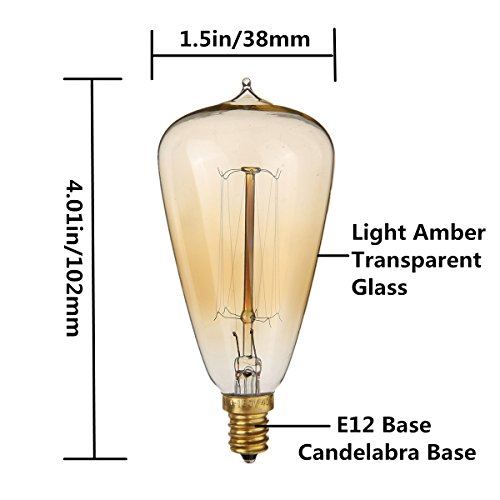 - ✔ Specification - Total bulb length is 4.01 inch. Bulb diameter is 1.5 inch. 110V, 40W, Candelabra base (E12), Dimmable, Warm Light (2200~2700K). Blister and foam protect, with shatterproof function. NB: These E12 vintage edison bulbs are ambient lights, it glows soft warm yellow light and will not make a bright light.
