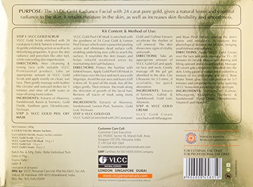 Natural Sciences Salon Series Gold Radiance Facial Kit is a complete Ayurvedic facial treatment kit made with the precision of modern science. Blending Pure 24 Carat Gold with special combinations of herbal extracts and oils, this unique 4 phase facial treatment offers you a professional salon quality treatment in the comfort of your own home. It begins with a gentle yet thoroughly exfoliating scrub, enhanced with pure gold and turmeric to clear away dirt, oils, and dead skin, and lift away black heads all the while purifying and fortifying the skin with healing actions of these two ingredients. The next stage in the process is the Gold Peel Off Mask, which is enhanced with 24 carat gold leaf and lemon peel oil to extract toxins from the skin and shrink pores, preventing them from again absorbing dirt and oil. Following this, the Gold Gel, infused with pure Gold and Gallnut extract, penetrates deep into the skin cells to moisturize them and encourage healthy and quick cell growth. Renewing the complexion and aiding in the healing process. This facial kit finishes with the rich and luxurious Gold Cream which is enriched with Wheatgerm oil and Rose Petal extract to nourish the skin with an abundance of essential vitamins and minerals. Natural Sciences Salon Series Gold Radiance Facial kit cleans, nourishes, moisturizes and protects the skin leaving it soft, supple, and radiant, restoring to it a glowing youthful complexion. Increase skin clarity & Smoothness Nourishes the skin tissues and helps rebuild weakened areas. Eliminates dead surface cells enabling underlying new cells to reach the surface Restores the skin's luster and radiance.Feature