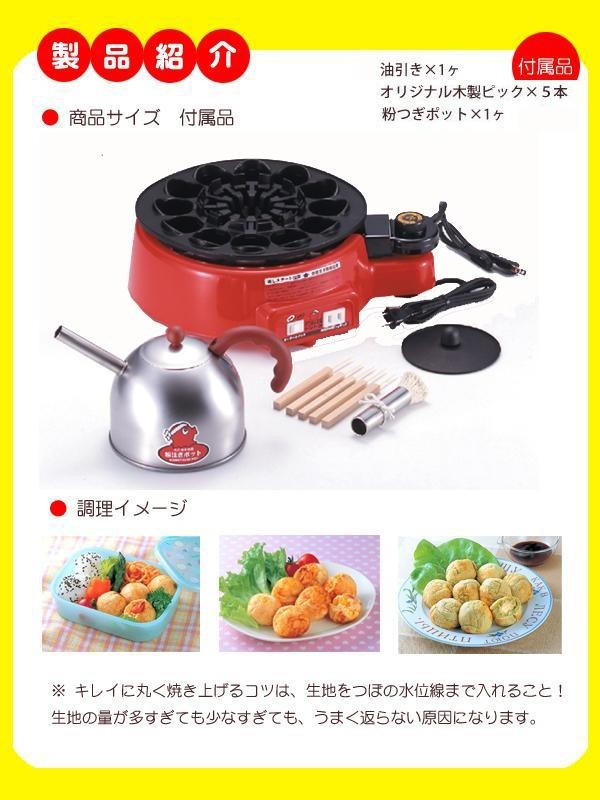 たこ焼きの生地をつぼの中に流し入れ、モータースイッチを入れると「自動返し運転」で、まん丸たこ焼きの出来上がり(回転を、5~6回繰り返すと丸く焼き上がります)。※キレイに丸く焼き上げるコツは、生地をつぼの水位線まで入れること!生地の量が多すぎても少なすぎても、うまく返らない原因になります。 |