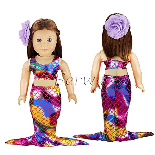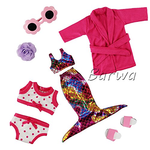 Barwa 3 Sets Summer Clothes Outfits Mermaid Dress and Swimsuits Set Pink Pajamas with Slippers for 18 Inch DollsPackage Included:1 set 18 inch doll mermaid dress ( top+mermaid dress+purple flower hair clip )