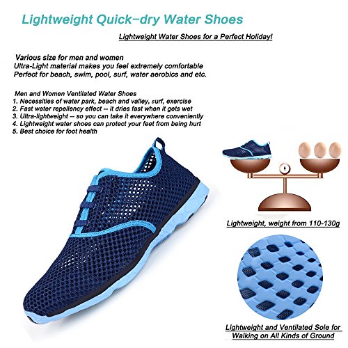 -. Feature : UNIQUE DESIGN IN SOLES: The unique iron mesh is designed at the bottom of the shoe,acting as a filter to prevent full of sand and pebbles when walking into the water. / QUICK DRY WITH DRAINAGE HOLES: Unique and top-quality sole with holes on each bottom to ensure proper water flow out of them which creates a cooler and healthier shoe environment, quick-dry, super comfortable during water sports. / BREATHABLE & COMFORTABLE: Breathable and durable air mesh upper allow the foot to breathe, provides for superior breathability and quick drying.Smooth designed neck prevents chafing when wearing our water shoes. / ANTI-SLIP OUTSOLE AND DURABLE :Water Grip outsole provides exceptional traction in wet and slippery conditions.Excellent workmanship to prevent the seams around the toes fray and split within a short time. / LIGHTWEIGHT & EASY-ON CLOSURE: Light-weight EVA with rubber patch outsole,super lightweight,take it everywhere conveniently.Slip on style allows for easy wear & removal, well fit for various occasions.