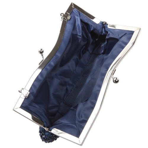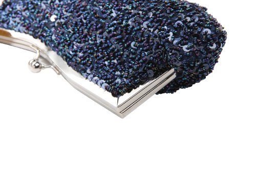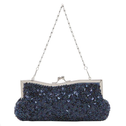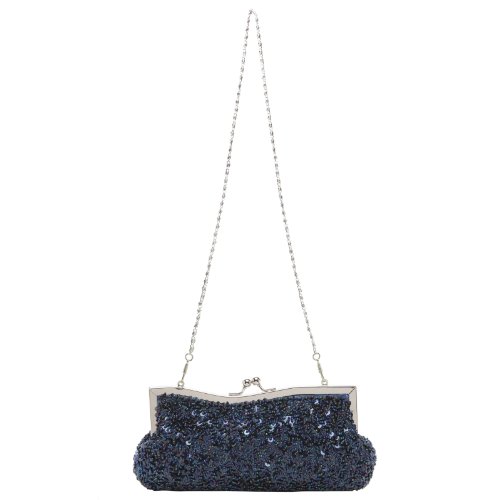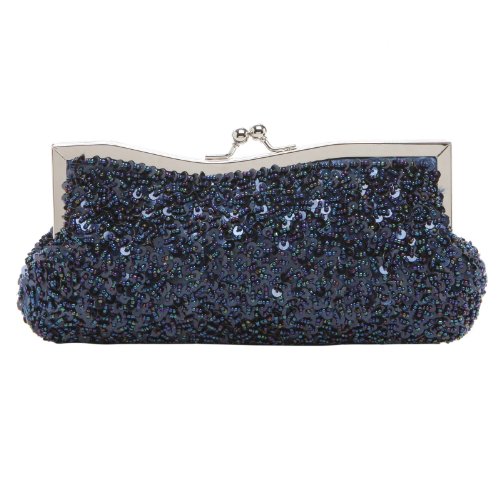 A dazzling evening bag covered in sparkling navy-colored sequins and accented with silver-tone hardware.