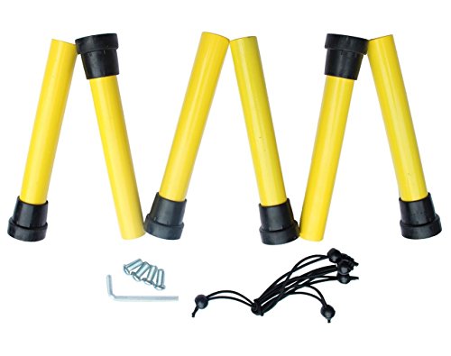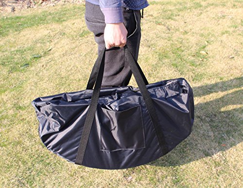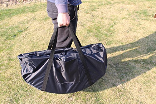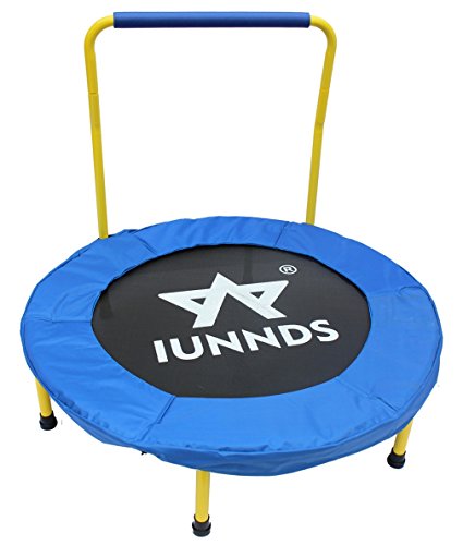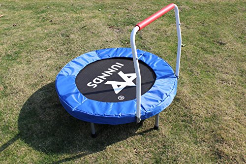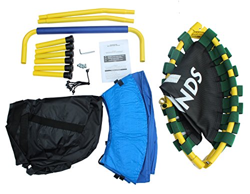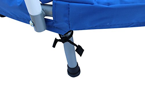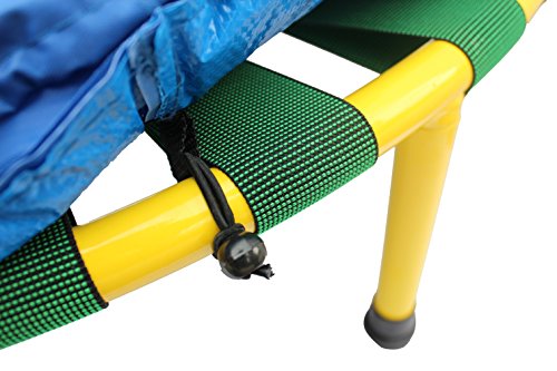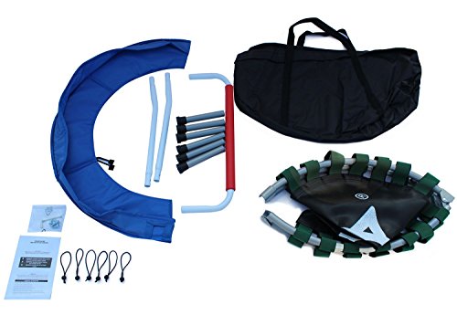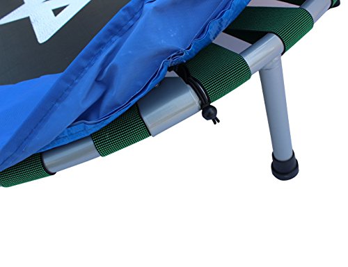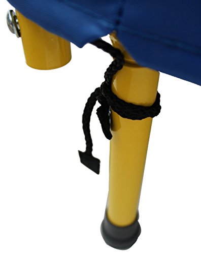 - Trampoline has a durable mat and tubular steel frame with a durable coated finish. - For extra safety, the padded cover around the mat cushions the frame and prevents children from stepping through the bungee cord. - Don't be fooled by its easy open and close mechanism - this folding trampoline supports up to 220 pounds! - Easy for travel or quick storage, just fold up the frame and close it! - FREE storage bag included!