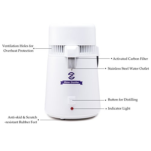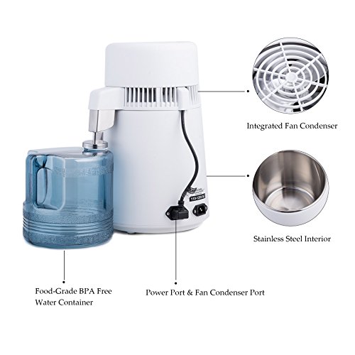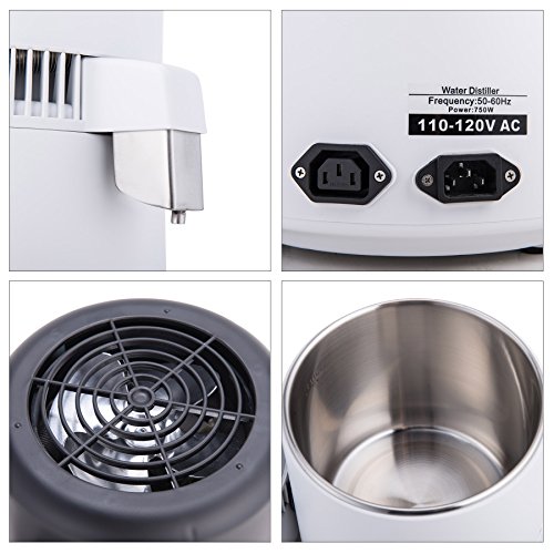 Description: Distilled water is widely used in dental products, vapourisers, humidifiers, CPAP machines, lead-acid batteries, engine cooling systems, steam irons, waterfalls, fish aquariums, etc. This water distiller is designed to produce 1.5 liters of pure steam distilled water in 60 minutes. The inner container is made of high grade 304 stainless steel. It processes water through heating, evaporation and condensation to separate pure, fresh water from contaminants. Specifications: Power: 750W Voltage: 110, 50Hz Rolled sheet types: >400 Stainless Steel Discharge Tube: 316L Inner Container: Stainless Steel 304 Chamber Size: about 9.05" (Dia.) x 15.35" (H) Electronic Heater: Aluminum Water Bottle: PC (246 deg.C) Inner Container: Stainless steel 304 Temperature Safeguard: power-off when temperature is 160 deg.C Inner Container Volume: 4L Distilled Water Capacity: 1.5L/H Outer Dimensions: 11x11x20inches/285x285x510mm Package includes: 1x Distiller 1x Store the Cask 0
