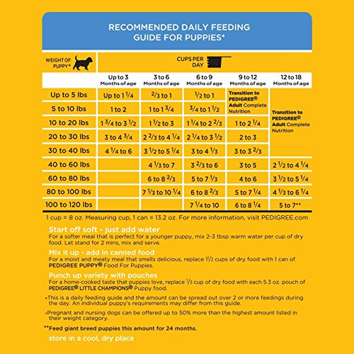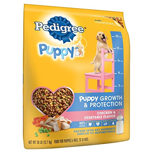 -. Binding : Misc. -. Brand : Pedigree -. EAN : 0688947757029 -. Feature : Contains one (1) 28-lb. bag of PEDIGREE Puppy Growth and Protection Chicken & Vegetable Flavor Dry Dog Food / PEDIGREE Puppy Food has an optimal balance of calcium and phosphorous to help puppies develop strong teeth and bones / Our kibble for puppies has a delicious chicken flavor your growing dog will love / Our balanced dog food promotes brain development with DHA / PEDIGREE Dry Puppy Food provides a desirable crunch dogs love -. Label : United States -. Manufacturer : United States -. PackageQuantity : 1 -. ProductGroup : Pet Products -. ProductTypeName : PET_SUPPLIES -. Publisher : United States -. Studio : United States -. Title : PEDIGREE Complete Nutrition Puppy Dry Dog Food Chicken 28 lbs. -. UPC : 688947757029