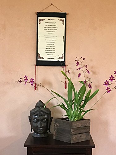 This hand woven scroll features a quote on A Precious Human Life by His Holiness the Dalai Lama. The quote is printed on the fabric, which hangs with wooden rods and a cord. There are a few embellishments printed on the scroll and two red tassels at the bottom of the scroll. This simple scroll would look nice hanging on a wall and serve as a reminder of how precious our life truly is.