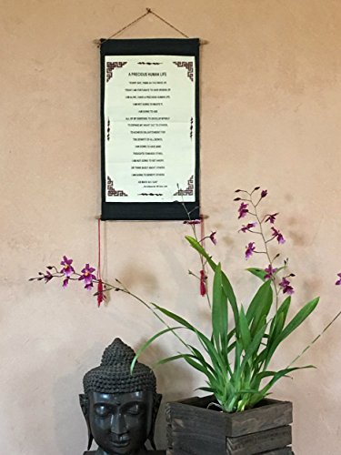 Beautiful cotton canvas scroll w/ printed Dalai Lama quotation on "A Precious Human Life" Made in India, a product of Tibetan Refugees Natural white color; Measures approximately 8" x 13.5" Perfect for your office, meditation room, Dharma center, shrine room, yoga studio, or puja room