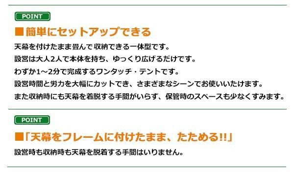 組み立ていらずで、開くだけでテントの設営ができます。野外・屋外でのお祭りやイベントに適しているテントです。2人で1~2分で設営でき、天幕をフレームに付けたまま収納できます。半横幕付きなので日除け率UP!! |