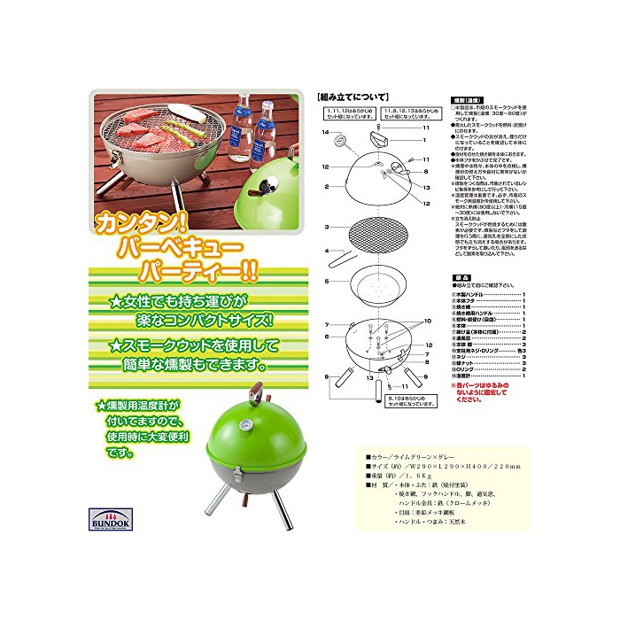 원본상품명: BUNDOK(バンドック) ミニ グリル Q ?度計付 グリ?ン×グレ? BD-416LG 【2~3人用】 バ?ベキュ?コンロ 燻製 スモ?ク??