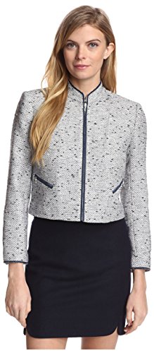 Shimmer tweed zip-front jacket with banded collar, contrasting organza trim and zip pockets