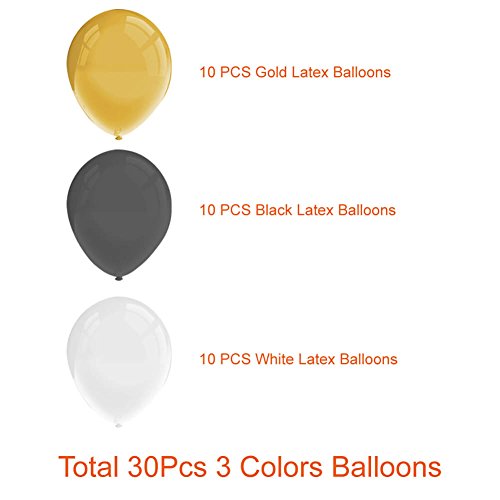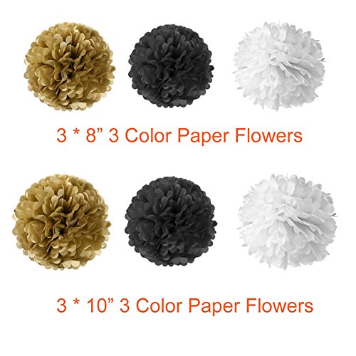 Packing List: -6pcs tissue paper flowers: 2pcs black (1*8" 1*10") 2pcs gold (1*8" 1*10") 2pcs white (1*8" 1*10") -15pcs paper tassels in black, white and gold glitter color, each color come with 5pcs -30 pack 12-inch latex party balloons, 10pcs black, 10pcs gold and 10pcs off white - A pack of gold foil fringe shiny curtain