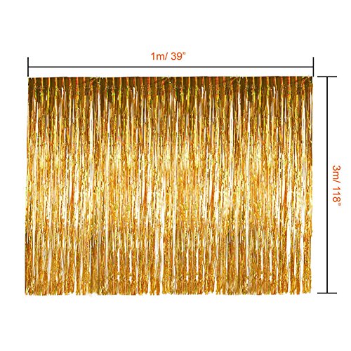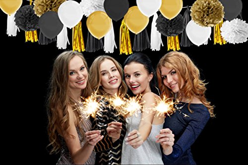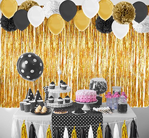 Paxcoo Black and gold party decorations include paper pom poms, tassels and a pack of gold foil fringe shiny curtain which are pre-cut and pre-folded for hanging and detailed instruction are included. This set also contains with 30 pack vivid balloons which can make a charm to your party. Just be ready for you to follow the simple instructions to bloom them. When you have finished, they will be puffy and can be hung from branches and ceilings, or open against a wall, be scattered as dessert table decor, or placed in vases as unique centerpieces